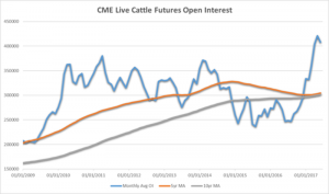CME’s 10 highest-ever daily open interest figures for Live Cattle futures (the contract was launched in 1964) have been posted since late April, topped by 431,718 contracts at the close of trading May 2. Live cattle open interest averaged 407,800 contracts during June 2017, up 33 percent from the five-year average.